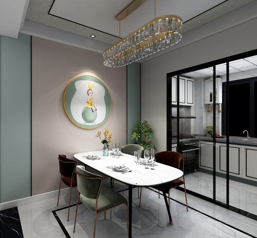 餐廳順應柔和的燈光,搭上粉色和藍色的墻面,環繞柔和韻味,沒有過多的擺設,只有家人一起聚餐時的快樂溫馨。