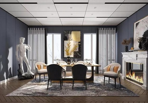 從視覺角度上講,小戶型可以利用吊頂將不同區域進行空間劃分,顯示出有高有低,使得空間更加錯落有致,改善大平頂帶來的視覺壓迫感。
