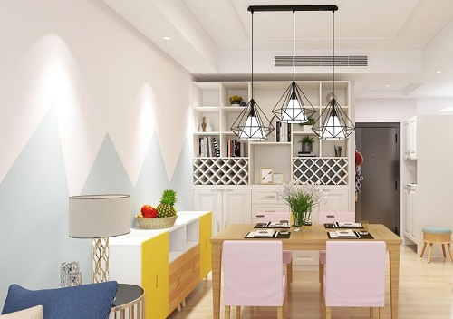 餐廳設計比較有濃濃的清新感,白色的餐邊柜,各種綠植花卉點綴,搭配原木系餐桌椅,仿佛身處自然界中,清新自然,讓業主的每一餐都能沉浸在藍天白云之中。