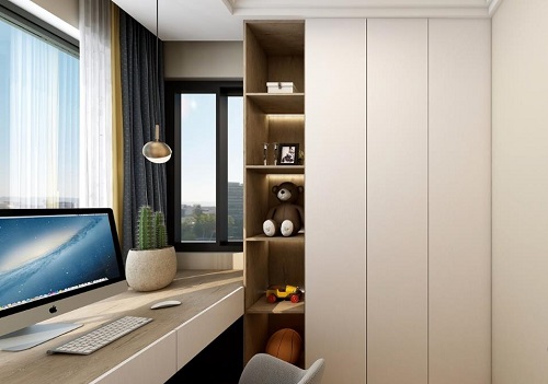 次臥是給孩子準備的,定制衣柜,結合了書桌、書柜等功能,方便孩子日常學習使用。