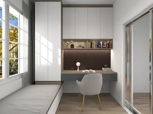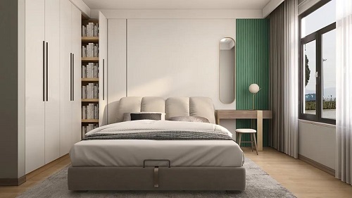 到頂?shù)囊鹿裨O(shè)計(jì),內(nèi)側(cè)設(shè)計(jì)成隱藏書柜,滿足業(yè)主睡前閱讀的需求,窗邊的梳妝臺(tái),偶爾可以充當(dāng)書桌,來滿足隨身辦公的需求。